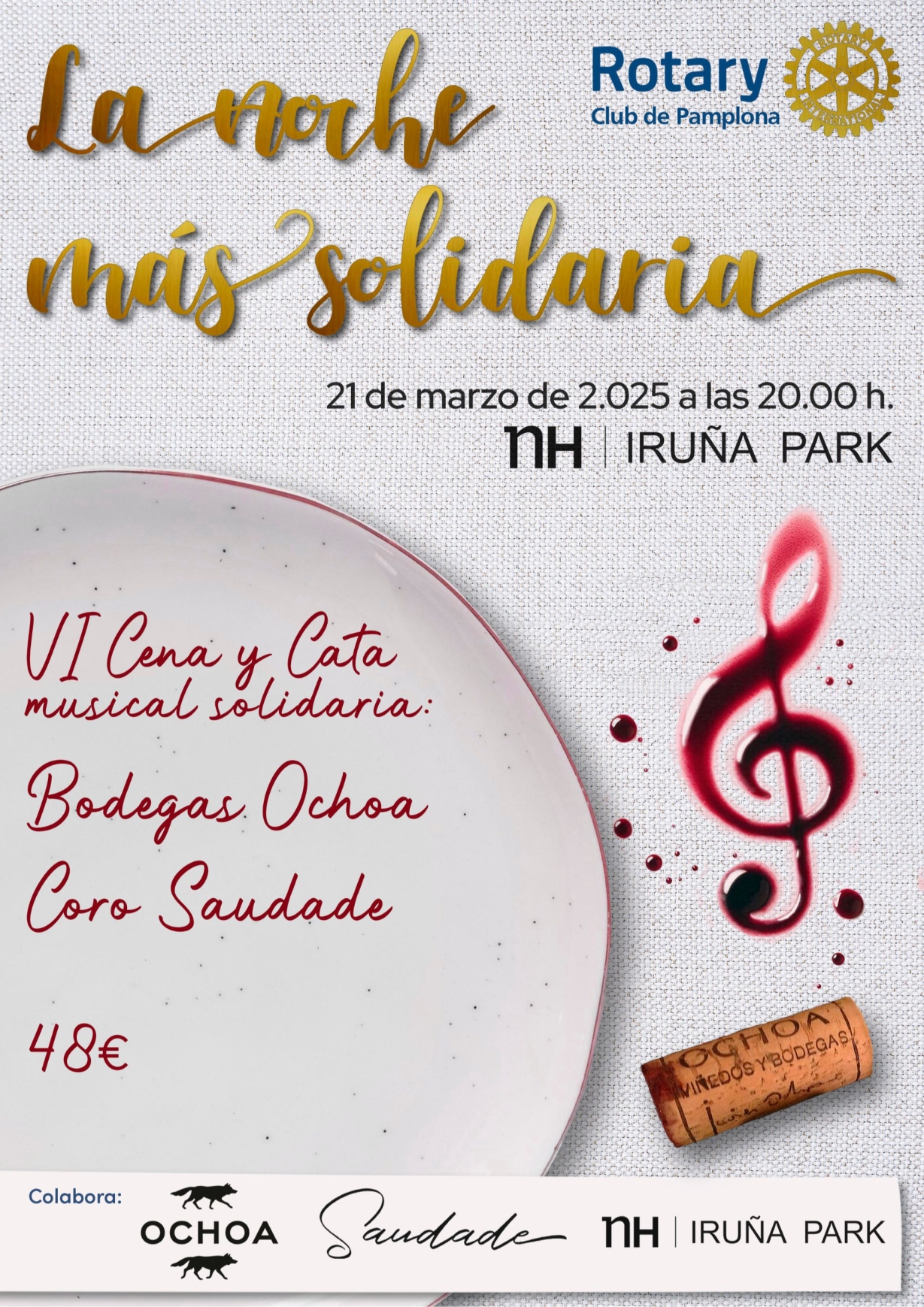 Rotary Club de Pamplona organiza la VI edición de LA NOCHE MÁS SOLIDARIA: una cena en el Hotel NH Iruña Park, con Cata de vinos de Bodegas Ochoa, música del Coro Saudade y un gran sorteo de regalos donde nadie se queda sin premio.
